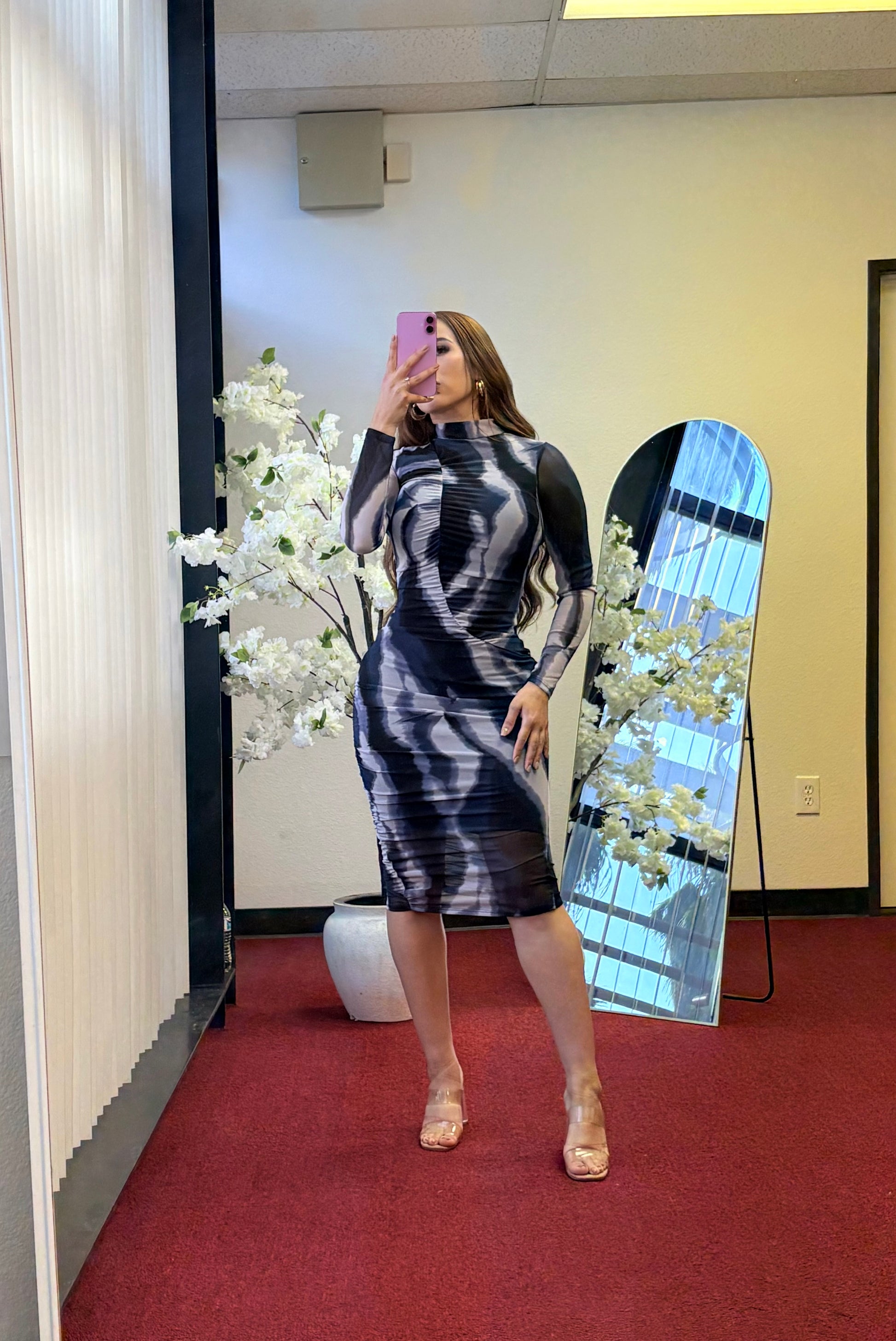 Print mesh long sleeve midi dress 95% polyester 5% spandex